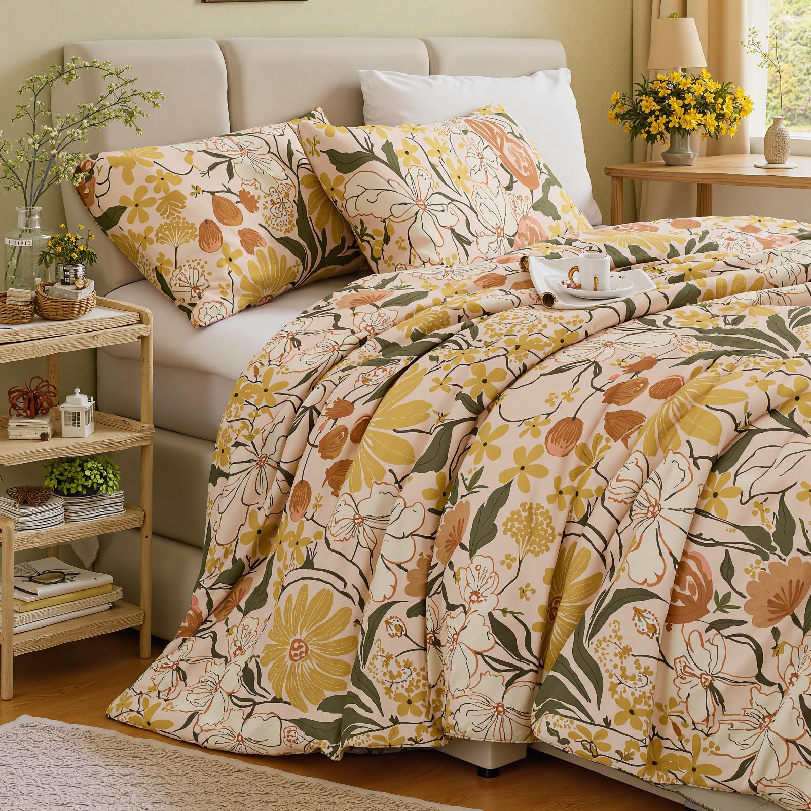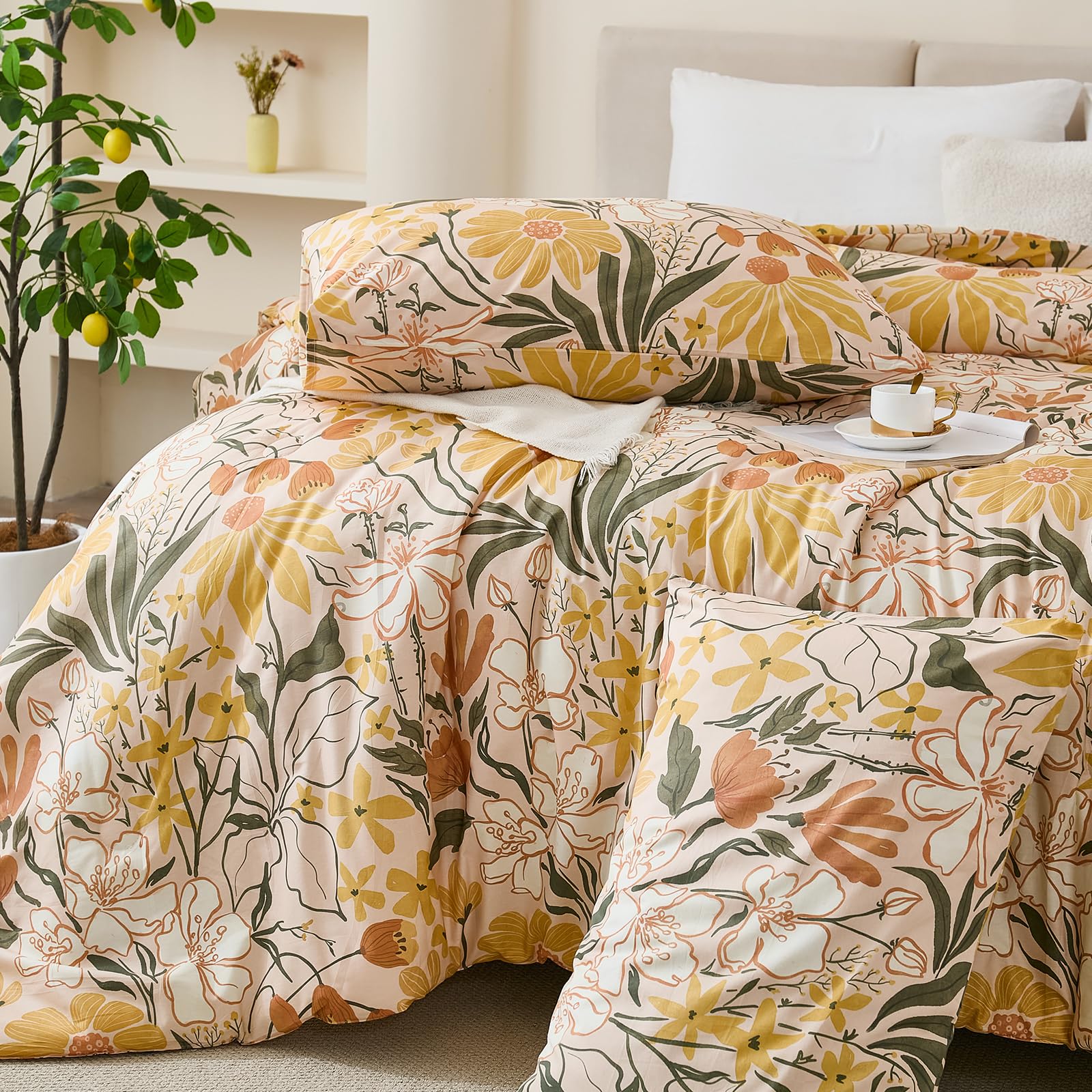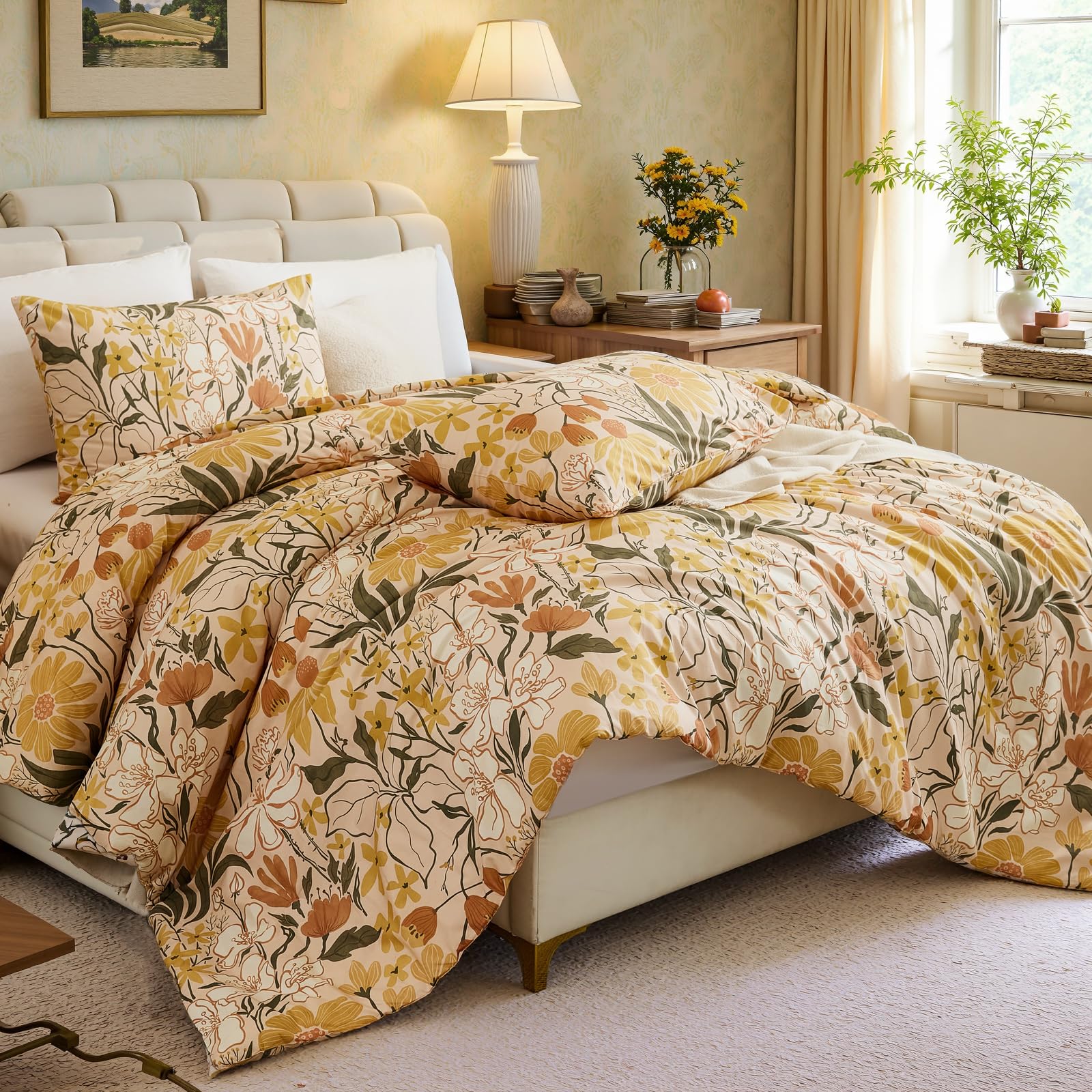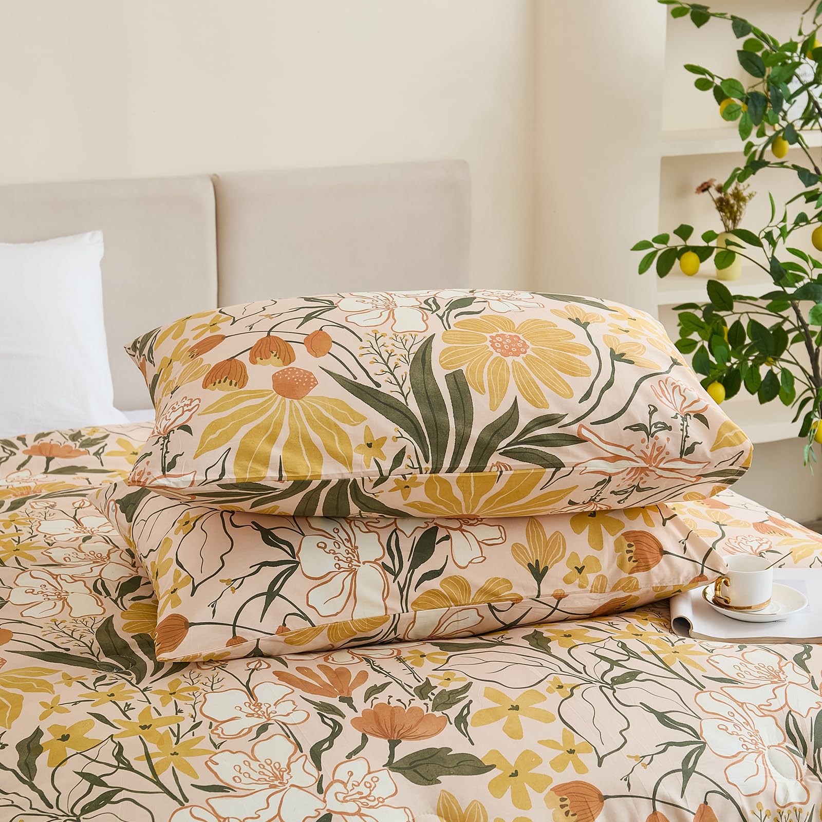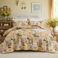 Bring the freshness of a cottage garden into your bedroom with this 100% cotton comforter set, featuring cheerful yellow flowers and green leaves on a soft background. Designed for year-round comfort, the lightweight polyester filling and breathable cotton create a cozy yet airy sleep space perfect for country-inspired decor.