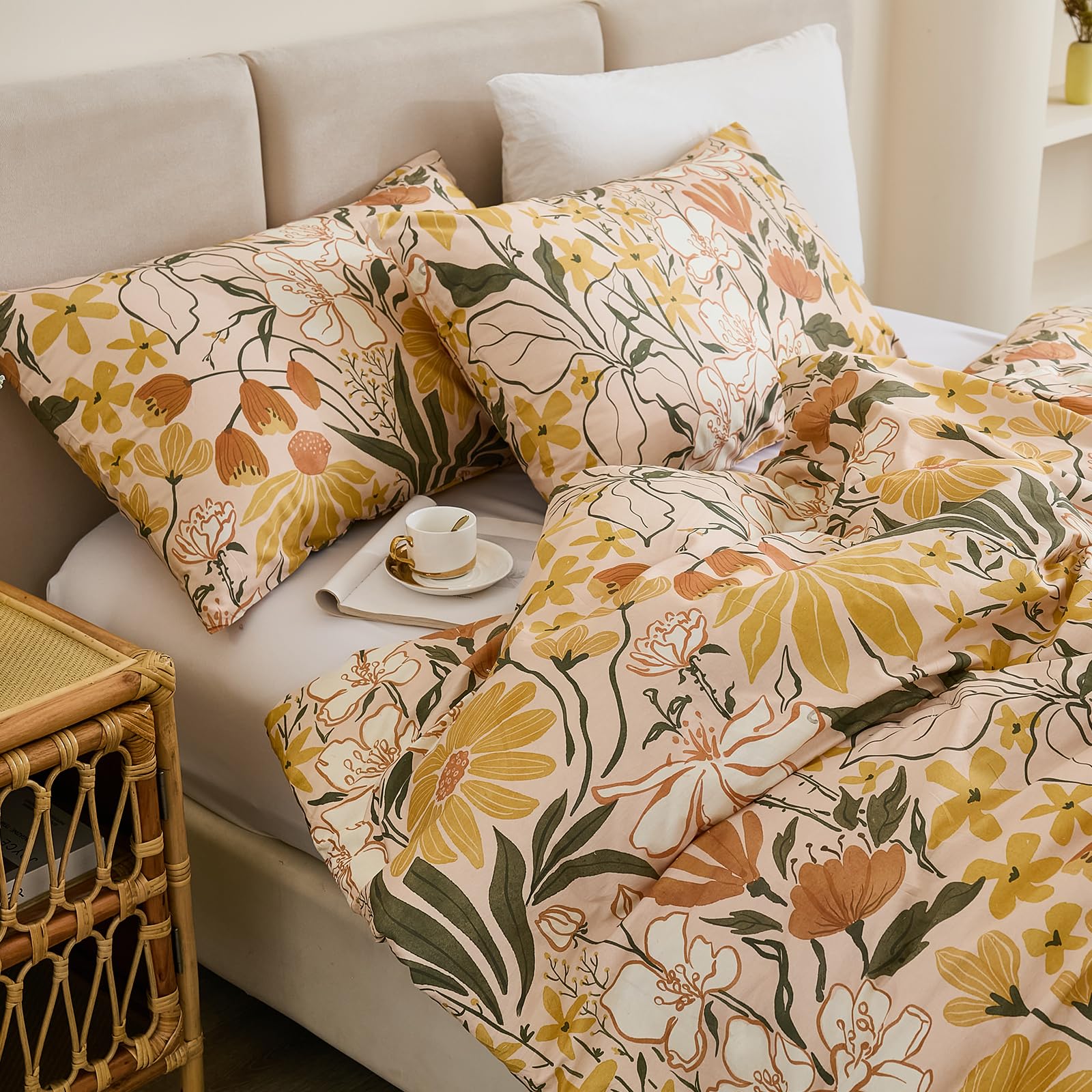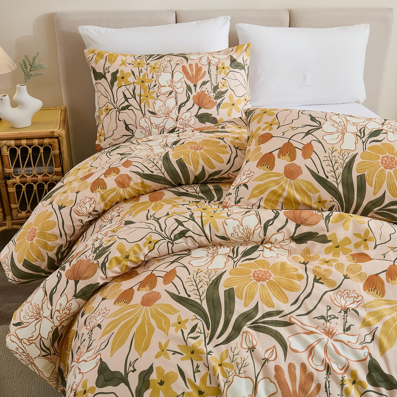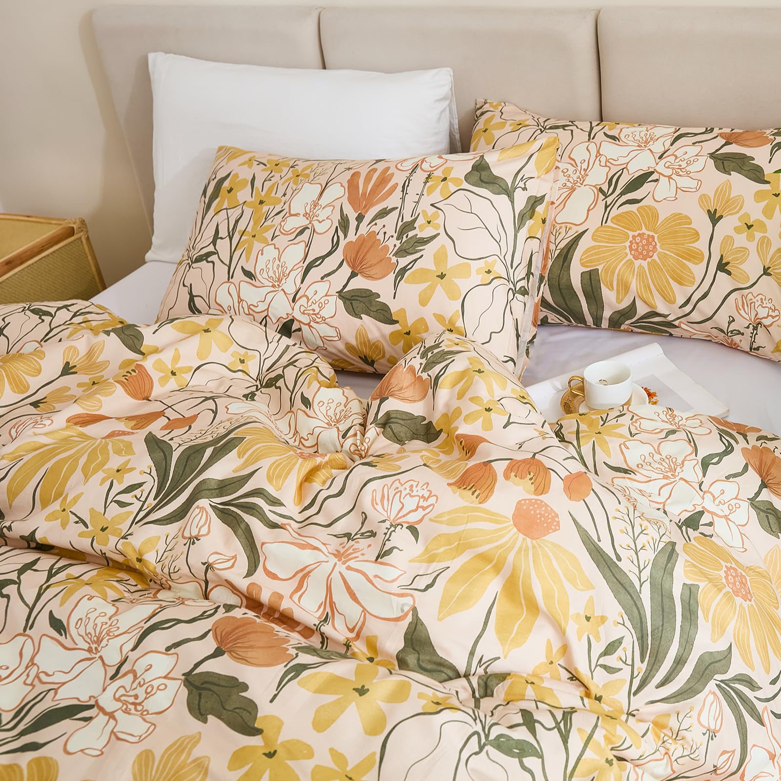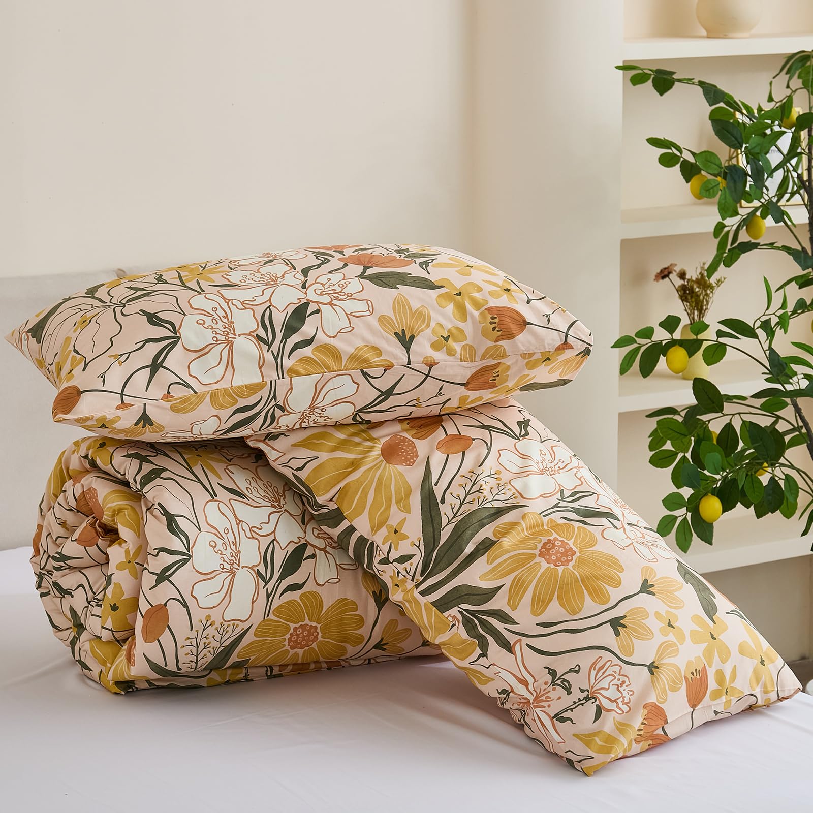 Bring the freshness of a cottage garden into your bedroom with this 100% cotton comforter set, featuring cheerful yellow flowers and green leaves on a soft background. Designed for year-round comfort, the lightweight polyester filling and breathable cotton create a cozy yet airy sleep space perfect for country-inspired decor.