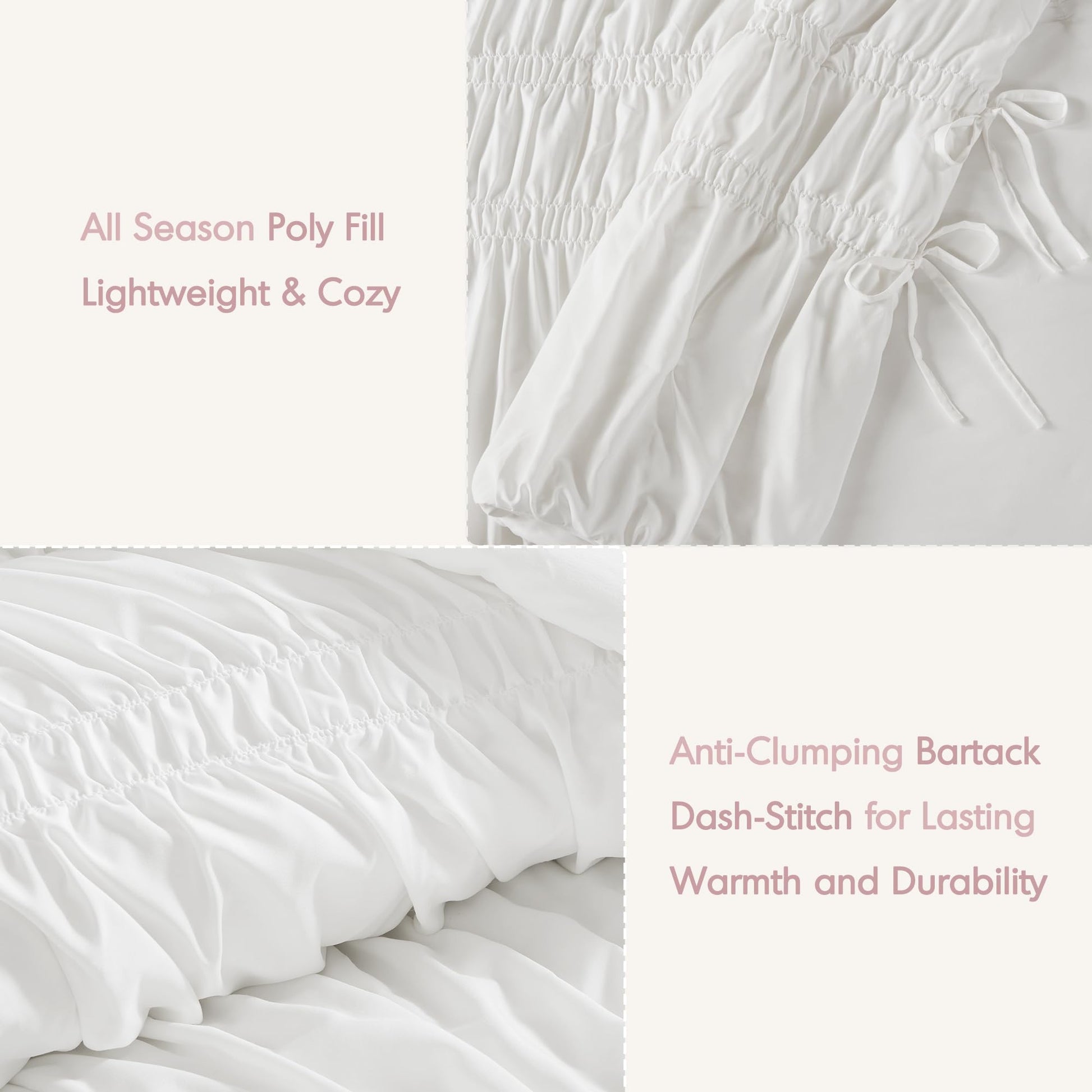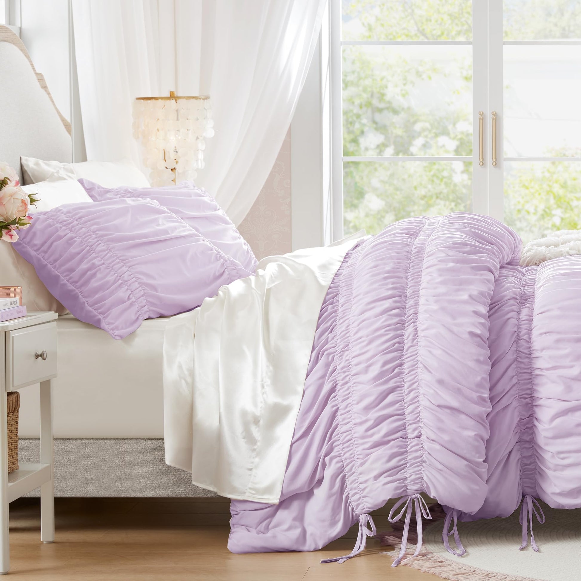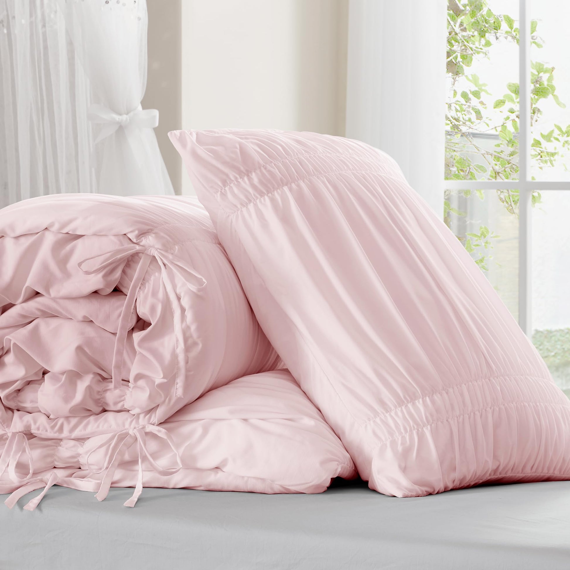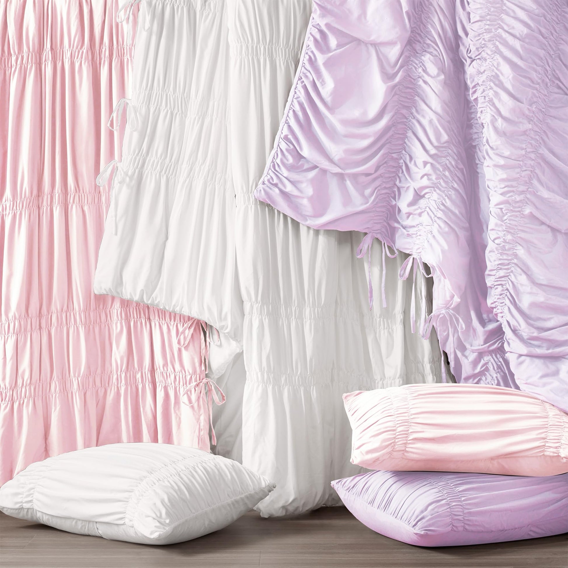 Embrace the gentle charm of French country style with this ruched comforter set, designed to bring softness and romance to your bedroom. The pre-washed microfiber fabric and lightweight fill offer year-round comfort, while delicate bow accents add a touch of shabby-chic elegance.