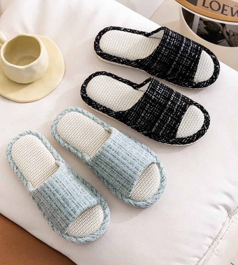 Designed for relaxed comfort, these unisex slide slippers combine breathable linen-cotton uppers with a flexible rubber sole. The open-toe design and quick-drying materials make them ideal for summer wear, offering lightweight support for indoor and outdoor use.