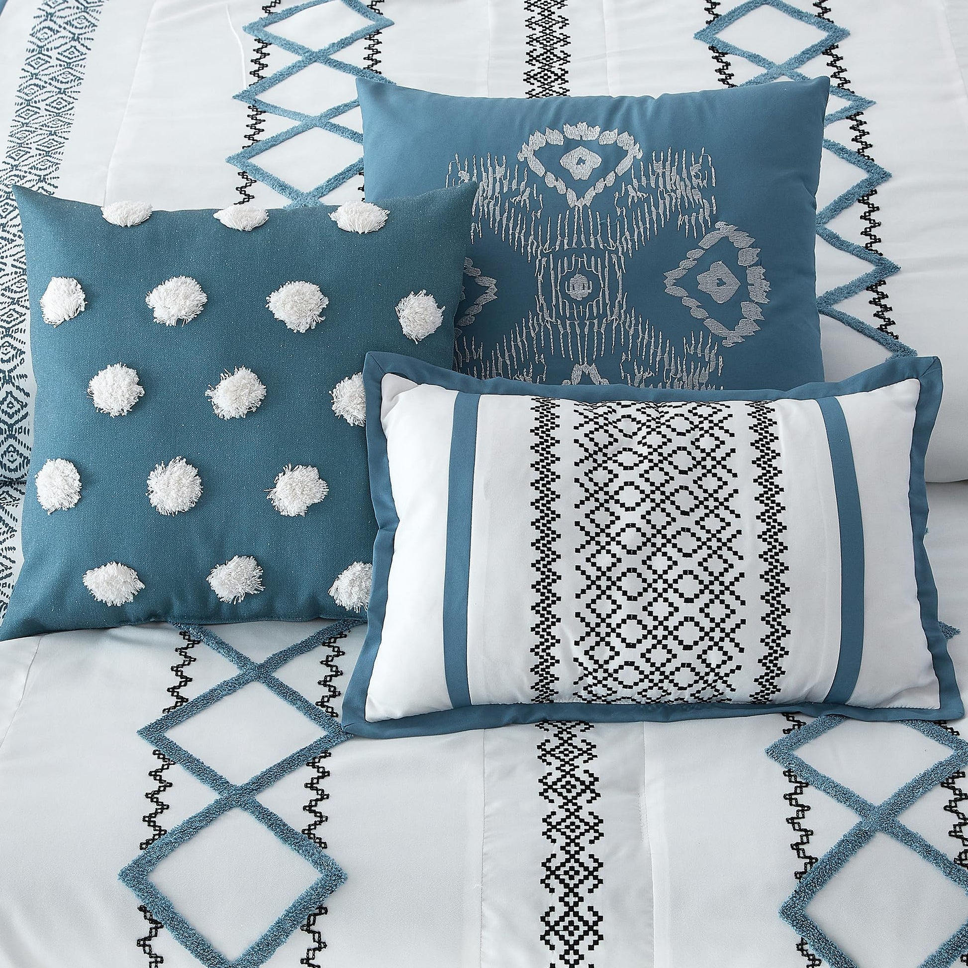 - Reversible comforter with geometric print and embroidered accents